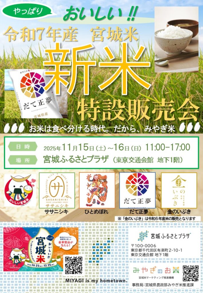 宮城ふるさとプラザが有楽町新店舗への移転してから初の開催を記念し、「米どころみやぎ」自慢の新米を通常よりお求めやすい特別価格で販売いたします!