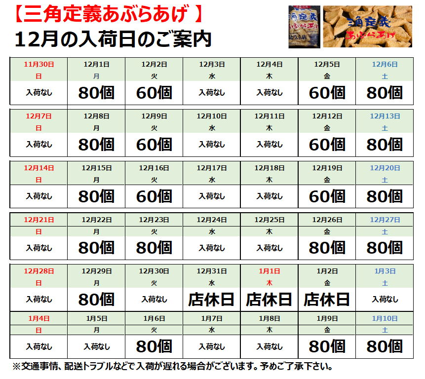 一日おきの入荷となっており、12月は奇数日の入荷となります。(12/1、12/3、12/5・・・)
