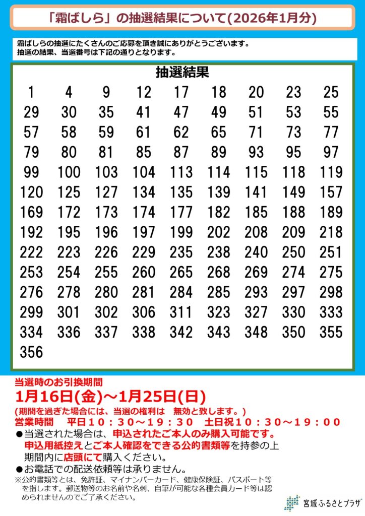 ご当選されましたお客様は、お申込時の申込書の半券、および申込書に記載のお名前を確認できる公的書類を持参の上、宮城ふるさとプラザ(有楽町・東京交通会館)店頭において、1月16日(金)から1月25日(日)の間に交換ご購入をお願いいたします。