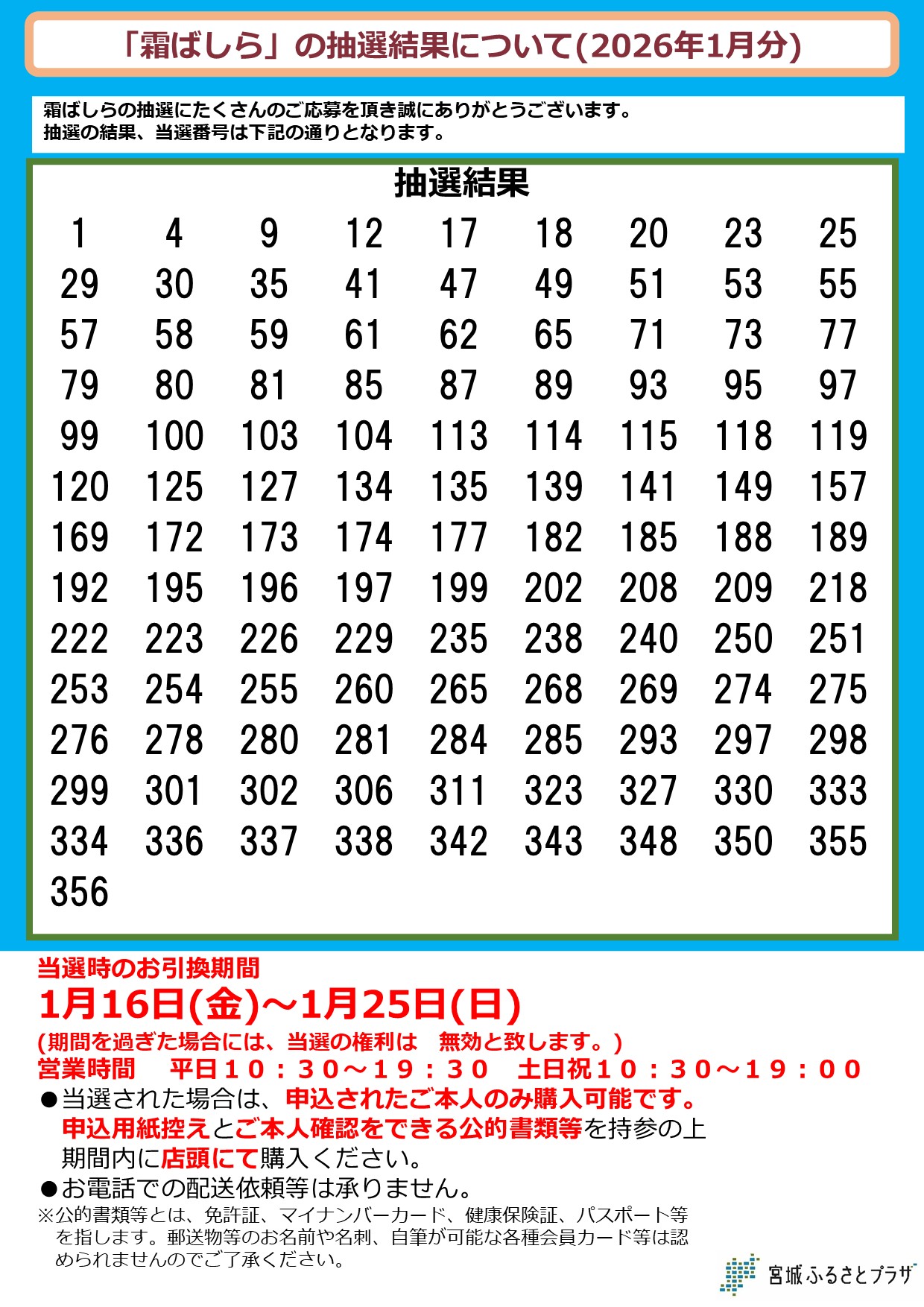 1月5日(月)~1月12日(月・祝)の間、抽選申し込みを受け付けておりました、霜ばしらの抽選販売について、以下の通り抽選結果が出ましたので、お知らせします。