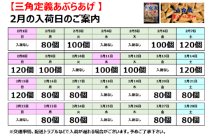 通常時は毎週月曜、水曜、土曜、週3回の入荷となりますが、2月は以下のスケジュールで商品の入荷を予定しております。