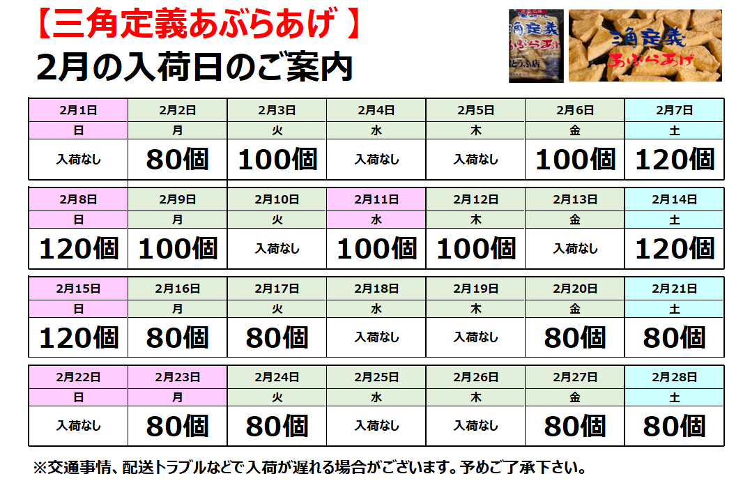 通常時は毎週月曜、水曜、土曜、週3回の入荷となりますが、2月は以下のスケジュールで商品の入荷を予定しております。