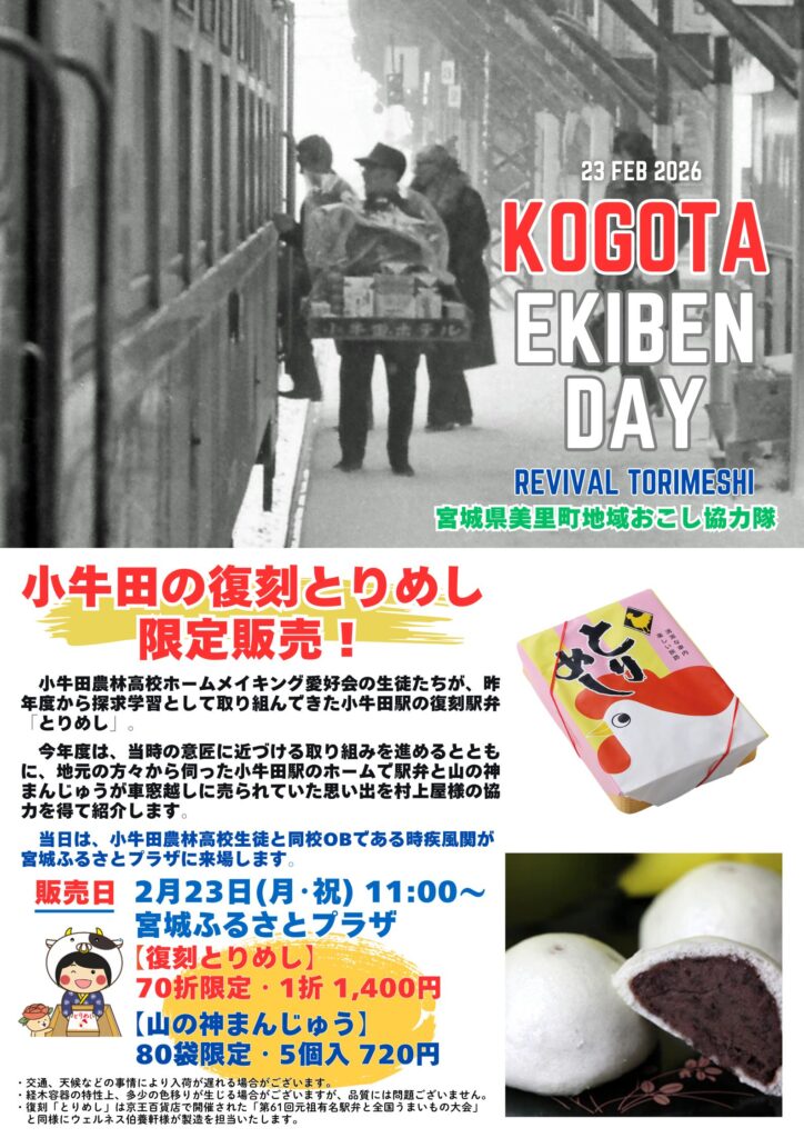 宮城県美里町にある、小牛田農林高校ホームメイキング愛好会の生徒の方々が学習の一環として取り組んできた、小牛田駅の駅弁「とりめし」を復活させるプロジェクトの集大成として、2月23日(月・祝)の一日限定で、宮城ふるさとプラザにおいて数量限定の特別販売会を開催します!