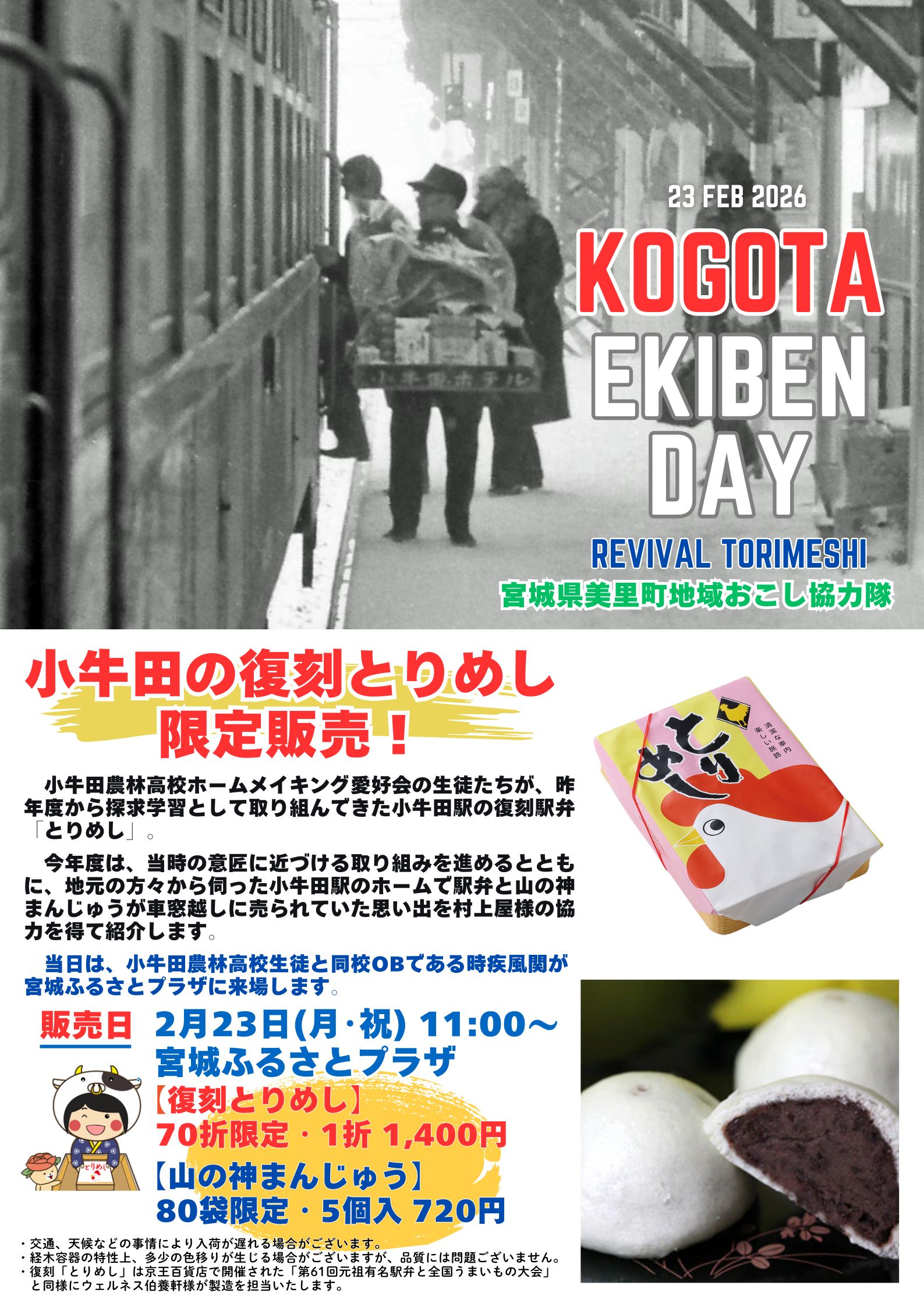宮城県美里町にある、小牛田農林高校ホームメイキング愛好会の生徒の方々が学習の一環として取り組んできた、小牛田駅の駅弁「とりめし」を復活させるプロジェクトの集大成として、2月23日(月・祝)の一日限定で、宮城ふるさとプラザにおいて数量限定の特別販売会を開催します!