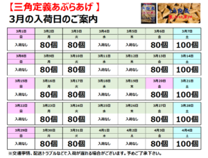 3月は、毎週月曜、水曜、土曜、週3回の入荷となります。