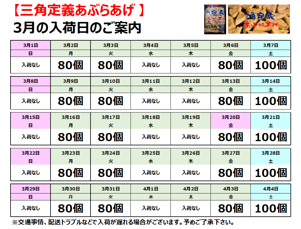 3月は、毎週月曜、水曜、土曜、週3回の入荷となります。