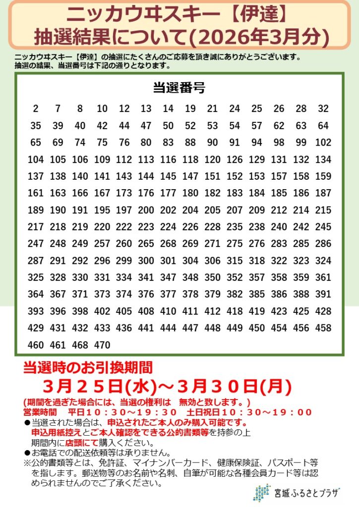 ご当選されましたお客様は、お申込時の申込書の半券、および申込書に記載のお名前を確認できる公的書類を持参の上、宮城ふるさとプラザ店頭において、3月25日(水)から3月30日(月)の間に交換ご購入をお願いいたします。